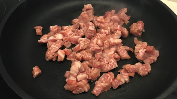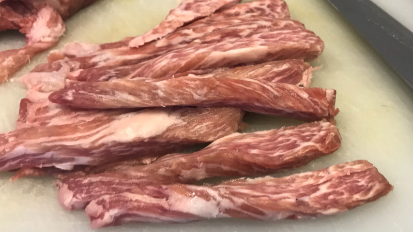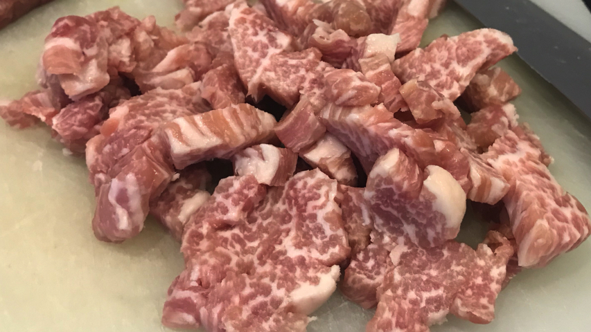 Limpia el secreto ibérico de la grasa excesiva. Corta en tiras y estas tiras en cubitos pequeños.