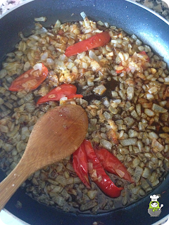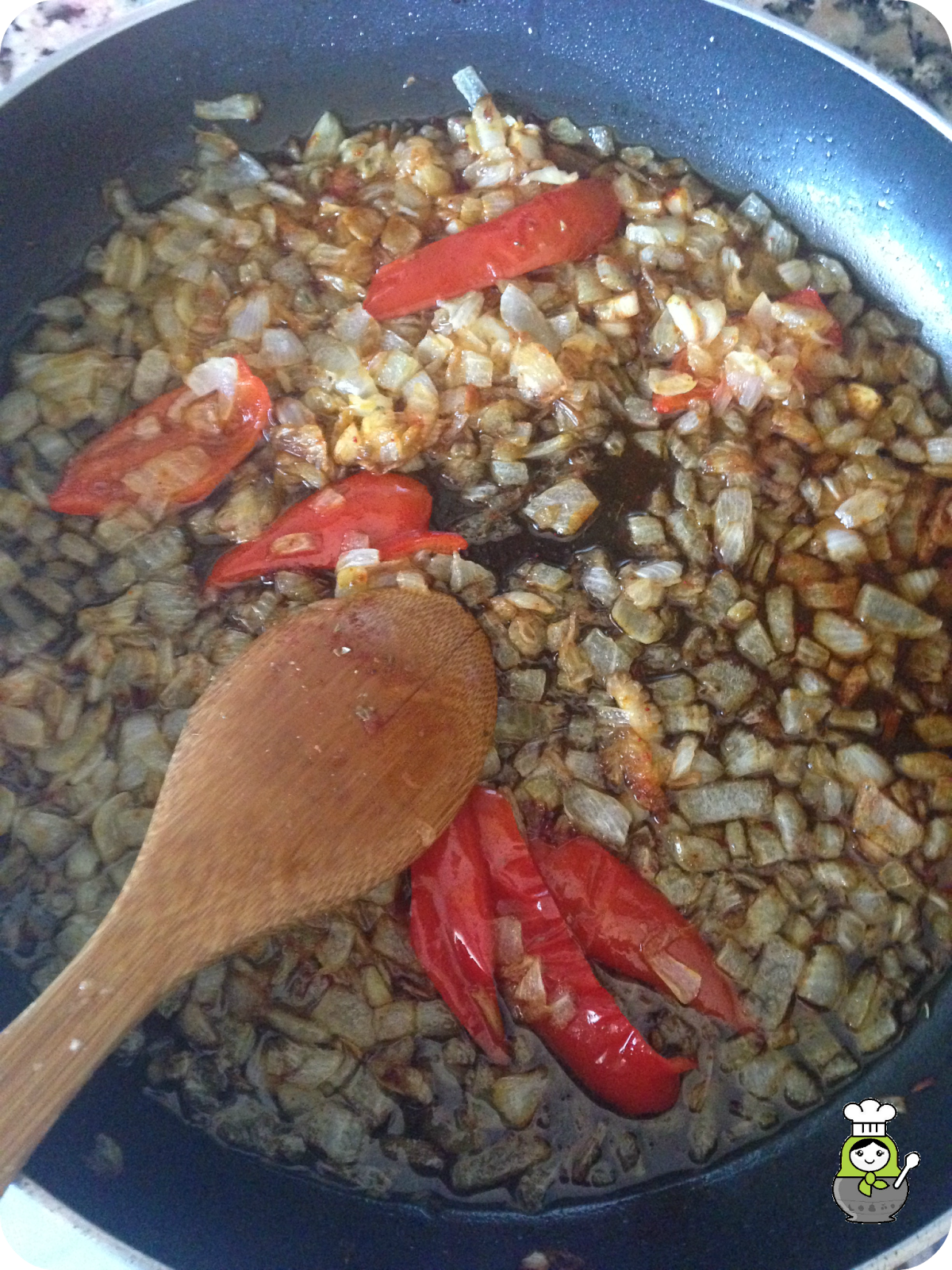 Para el relleno, necesitamos preparar el sofrito que acompañará a las xoubas. Para ello, hay que picar la cebolla y sofreírla junto con el pimiento morrón cortado en trozos grandes en abundante aceite de oliva a fuego medio.