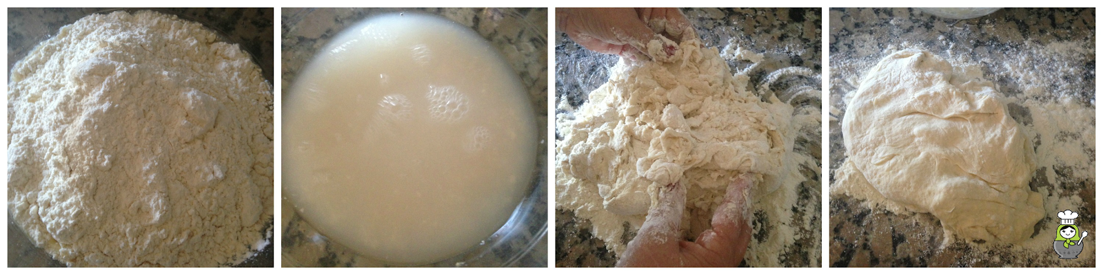 En un bol, colocamos la harina junto con la sal en forma de volcán. Calentamos ligeramente el agua y disolvemos la levadura. Vertemos el agua en el centro de la harina. Mezclamos todo con las manos y amasamos hasta que no se pegue. Dejamos reposar la masa dentro del bol cubierta con un trapo de algodón en un lugar sin corrientes de aire durante 45 minutos aproximadamente.