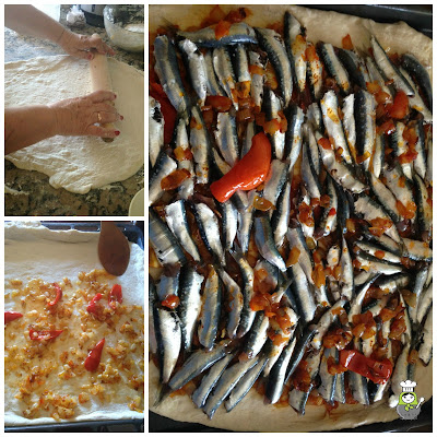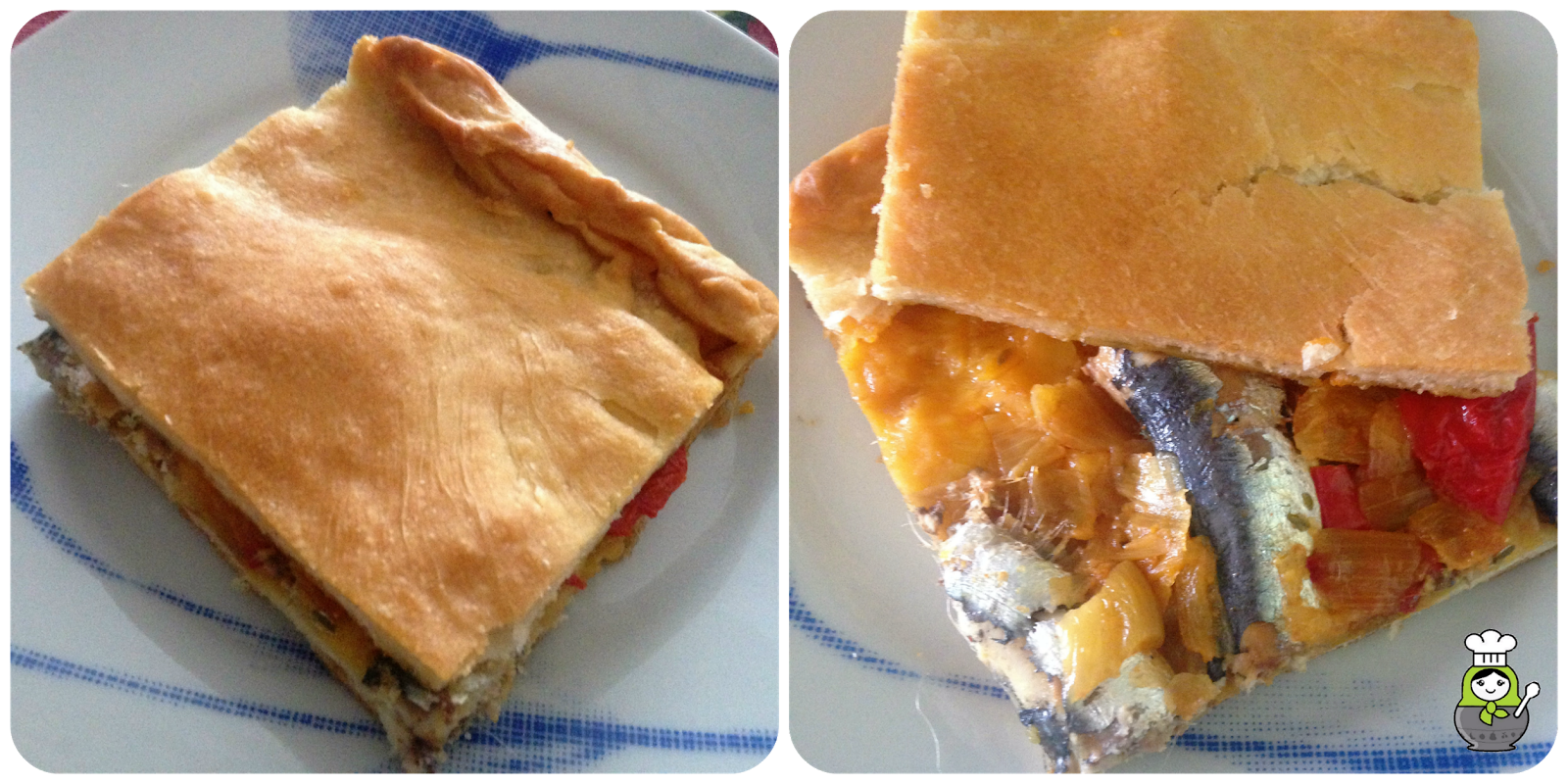 Una vez que ha levedado la masa, la dividimos en dos porciones y la estiramos con ayuda de un rodillo. Colocamos la primera plancha de masa en la bandeja del horno previamente engrasada con aceite de oliva. Cubrimos toda la plancha con la mitad del sofrito dejando libre un borde de unos 2 cm. y colocamos encima las xoubas. Echamos por encima el sofrito restante y cubrimos con la segunda plancha de masa.