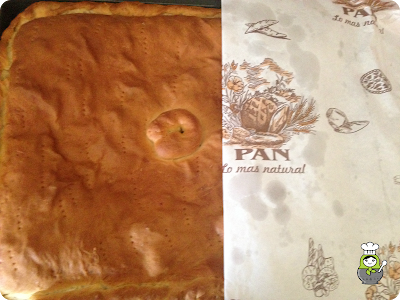 Ahora queda el paso más complicado que es cerrar la empanada. Debéis estirar la plancha inferior de masa y llevarla casi por encima de la plancha superior e ir trenzando las dos masas con pequeños giros con ayuda de los dedos índice y pulgar (y si no sois capaces, podéis recurrir al método más rudimentario de ir sellando las dos masas con ayuda de un tenedor). Por último, vamos a hacer una "chimenea" a nuestra empanada, haciendo un agujero en el centro y la pintamos con aceite de oliva. Ya solo queda hornearla a 180-190º hasta que se dore (durante 25-30 minutos aproximadamente).