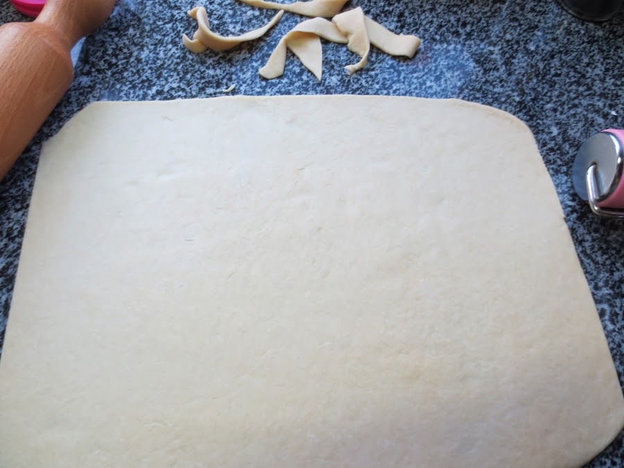 4- Estirar la masa bien finita, recortar bordes, (rectángulo de unos 40 x 30 cm).