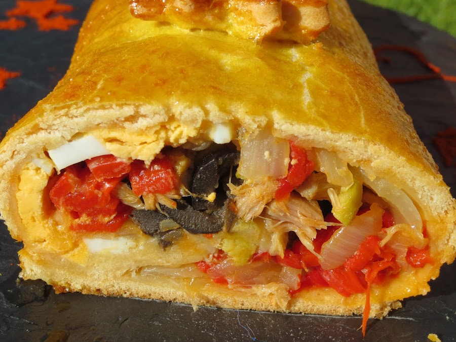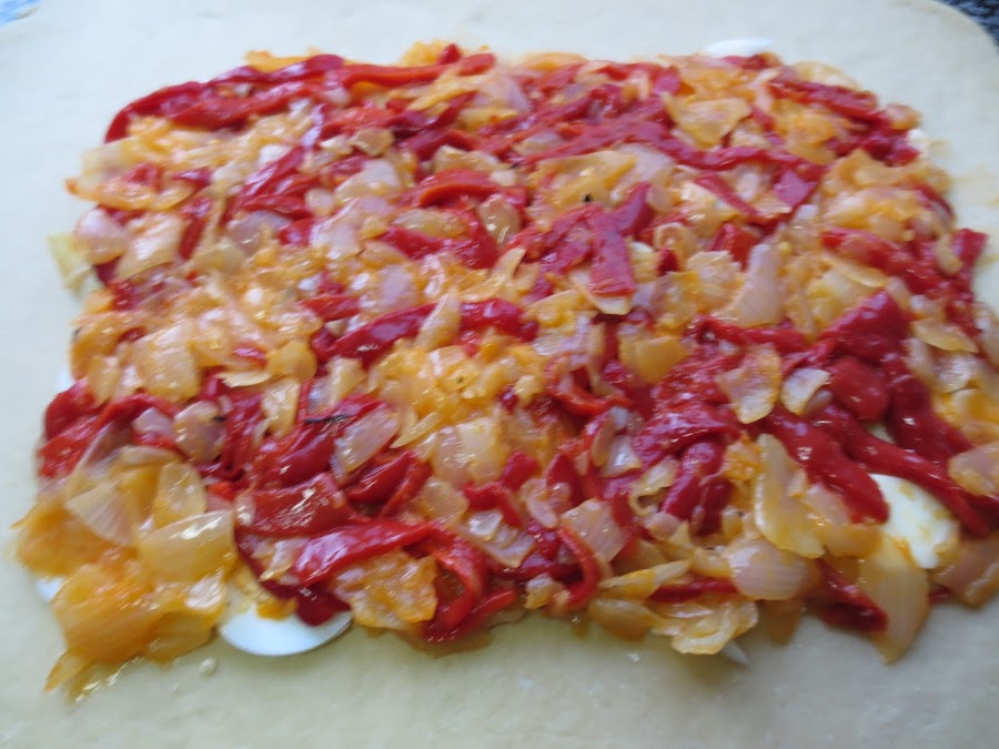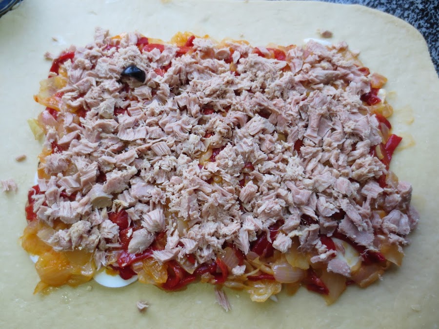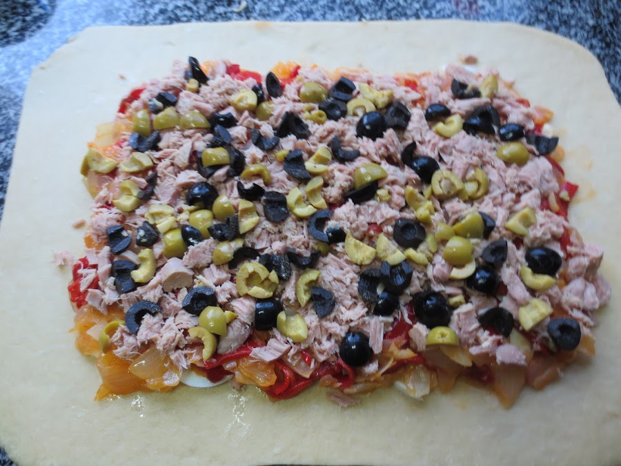 Relleno 1: Extender los huevos en láminas, el sofrito y repartir atún desmigado y aceitunas en trozos.