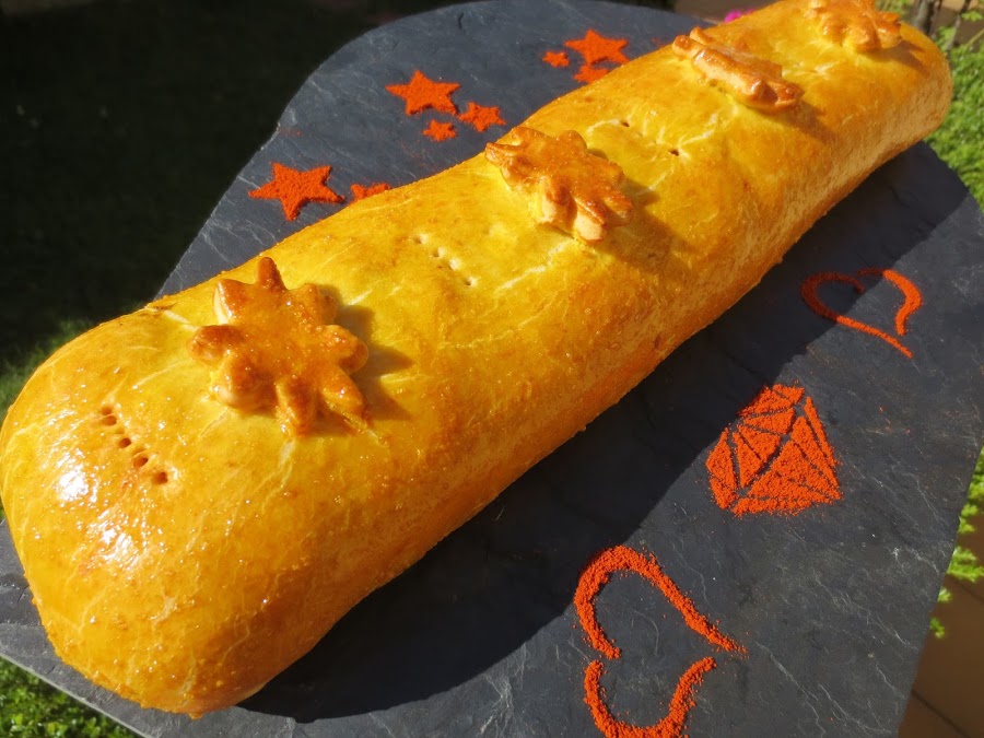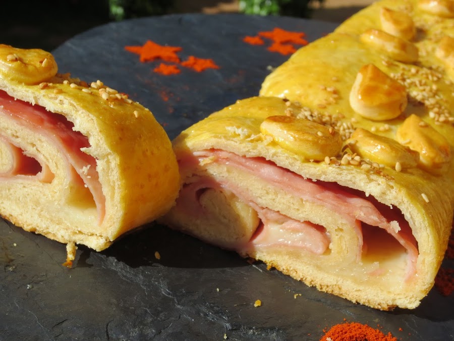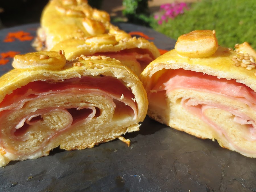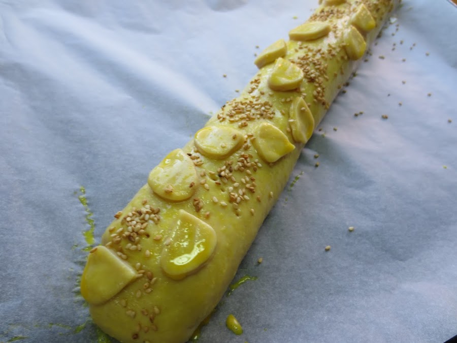 Enrollar, someter los bordes para dentro, pintar con yema batida con una cta. agua y espolvorear con sésamo, opcional. Yo aprovecho los recortes y pongo adornitos.