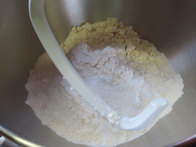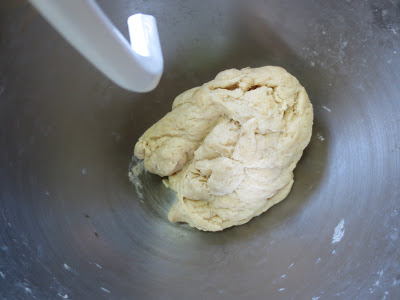 3- Añadir el aceite (completo con aceite de oliva más el de la lata de atún, si es la de jamón y queso, aceite de oliva y girasol mezcladas) , leche y agua, mezclados en una jarrita, con la KA en marcha en velocidad 2. Hasta que se despegue de las paredes.