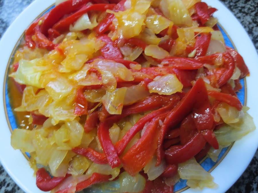 2- Añadir el pimiento en tiras y sal, sofreír 2 minutos a fuego medio-alto. dejar enfriar mientras hacemos la masa.