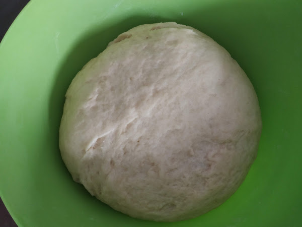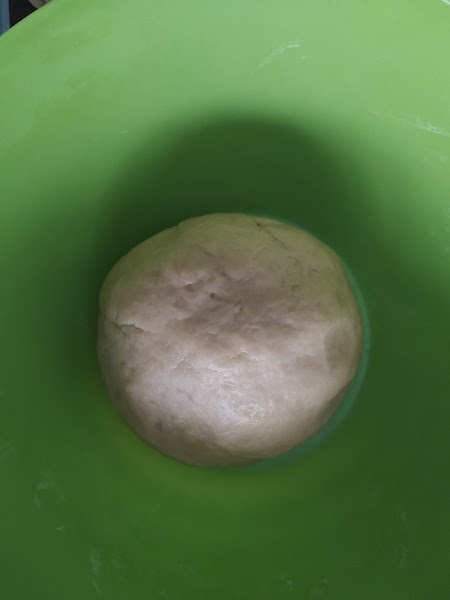 ahora procederemos a mezclar de dentro hacia afuera (yo lo he hecho con las manos, podéis hacerlo con una cuchara) para que se vayan integrando todos los ingredientes, ahora amasaremos durante 10 minutos aproximadamente sobre el banco de la cocina hasta que obtengáis una masa fina, suave y no se os pegue en las manos, le damos forma de pelota y la metemos en el bol,