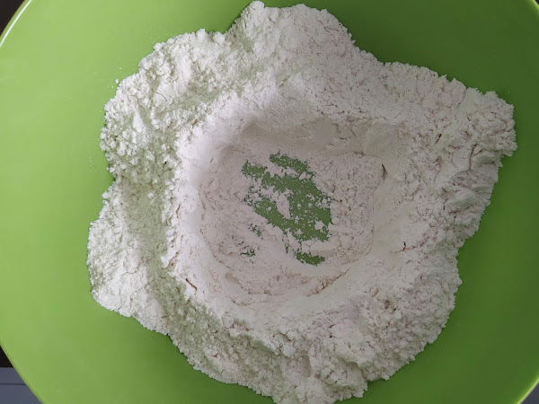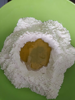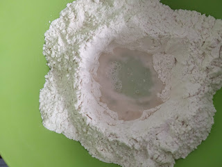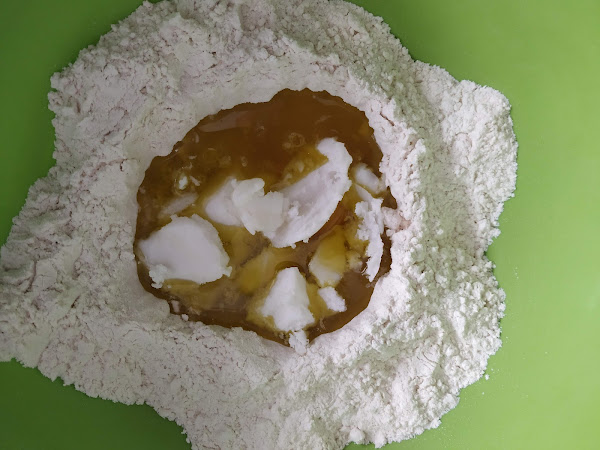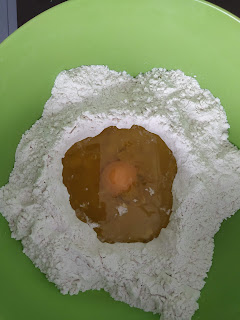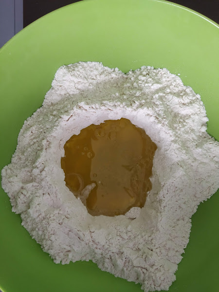 En primer lugar cogeremos un bol y echaremos la harina formando un volcán en el centro,