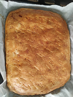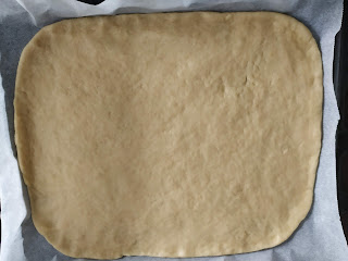 estiráis cada una en un papel diferente así será más fácil luego a la hora de tapar, cuando tengáis estirada la parte de abajo, la colocamos en una bandeja de horno y echaremos el relleno encima de ella repartiendo de forma uniforme por toda la masa sin llegar a los extremos para poder luego sellar y que no se nos salga el relleno,