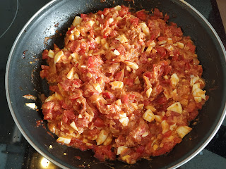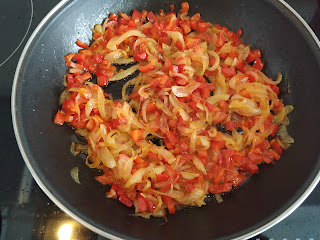 una vez estén pochadas las verduras añadiremos el tomate, removemos para que se mezcle y dejamos que se vaya haciendo durante 15 minutos,