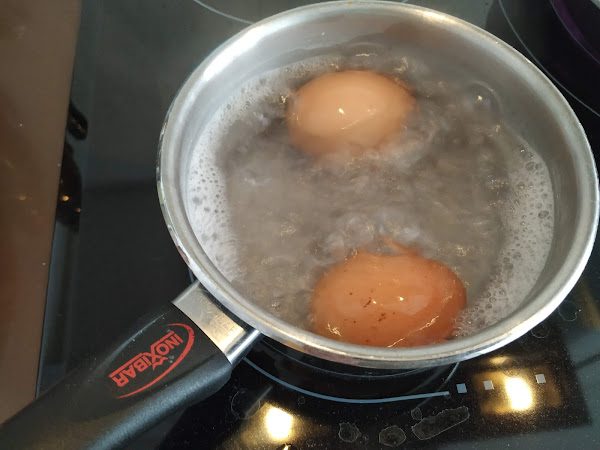 mientras se va haciendo cogeremos un cazo, ponemos los huevos, rellenamos de agua y procederemos a cocerlos durante 10 minutos a partir que empiece a hervir el agua,