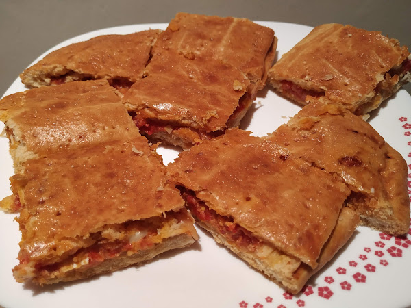 ahora ya procederemos a meterla en el horno que previamente habremos calentado a 180º aproximadamente durante 30-40 minutos dependiendo de cada horno, ir vigilándola de vez en cuando y cuando veáis que coge color apagáis, dejáis reposar 5 minutos en el horno apagado y ya sacamos, dejamos enfriar 10 minutos aproximadamente y cortáis con unas tijeras de cocina como más os guste, bueno ahora a servir y a disfrutar de esta fantástica y deliciosa empanada, espero que os guste, buen provecho