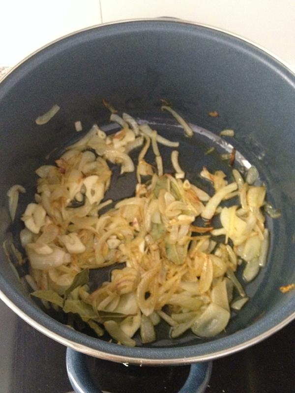 Cortar la cebolla en Juliana, sofreírla con un chorro de aceite ( más o menos 4 cucharadas) de oliva extra virgen en una sartén. Agrego dos dientes de ajo con la cebolla.