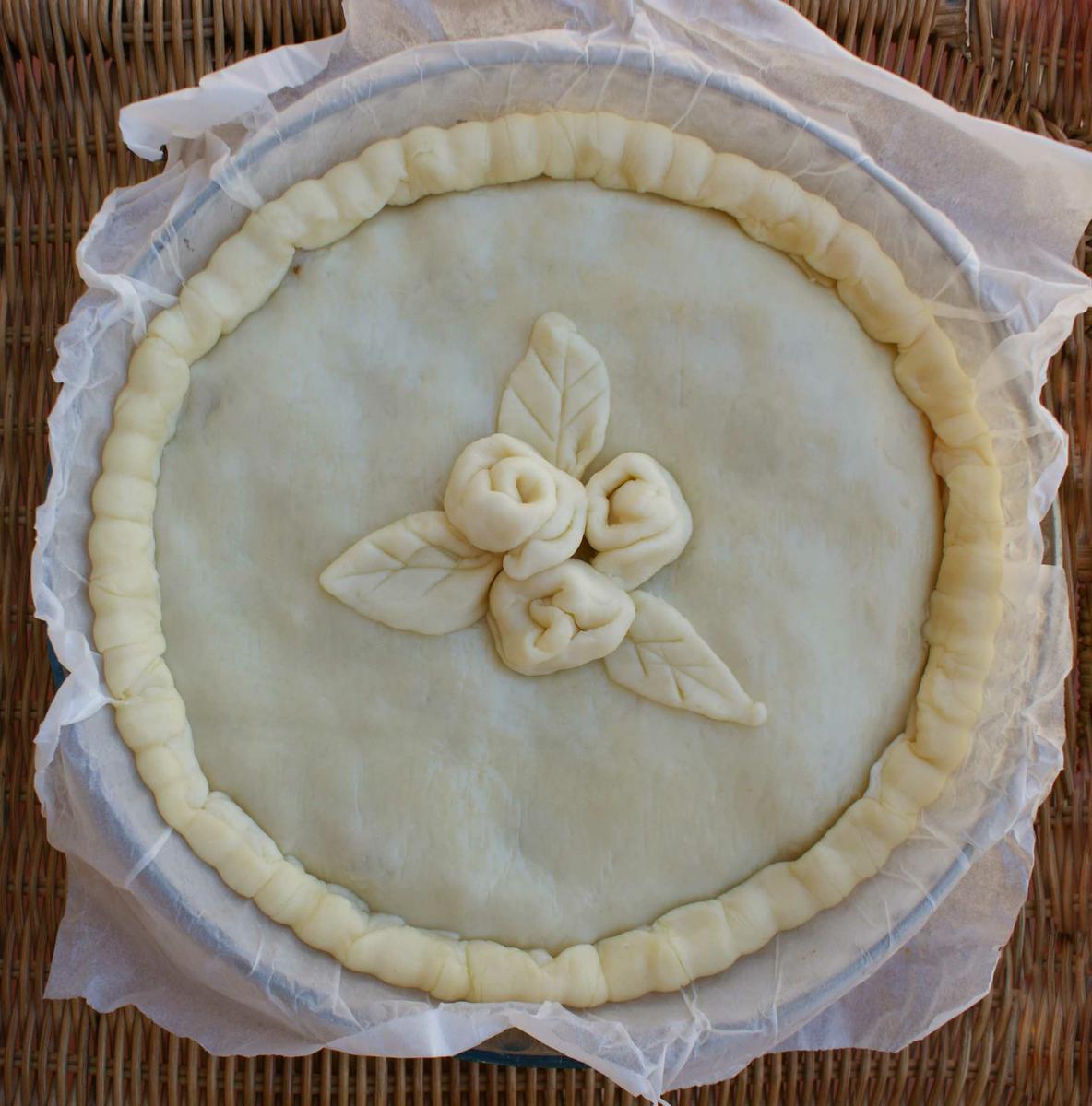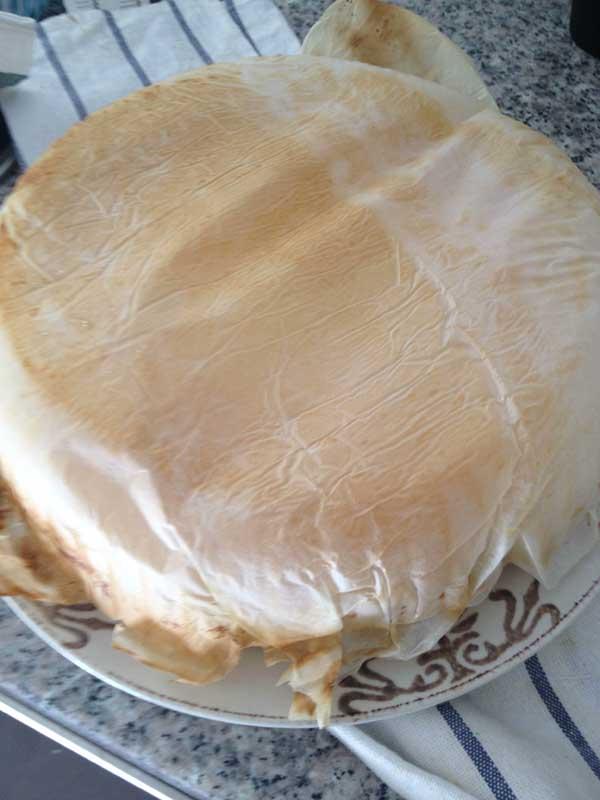 Extiendo la masa en una fuente para horno para tarta junto con el papel, dependiendo el diámetro saldrá mas grueso o mas fino el relleno.