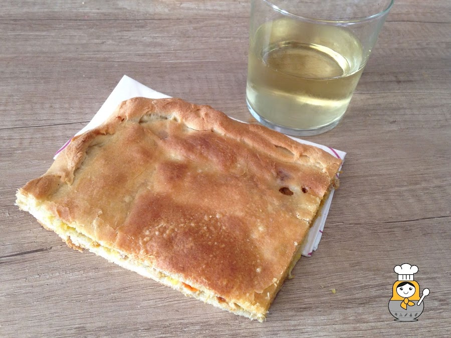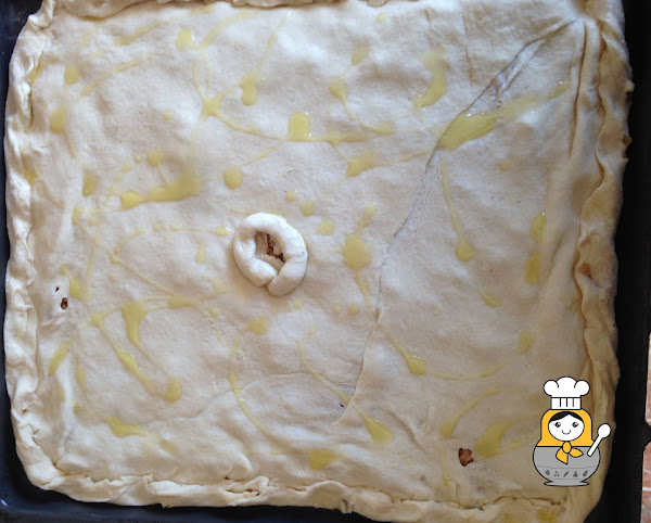 Cubrimos con el relleno toda la masa, dejando un margen de un par de centímetros de borde. Estiramos la otra mitad de la masa y cubrimos el relleno con esta segunda masa. Cerramos la empanada pinzando los bordes y realizamos un agujero en el centro que servirá de chimenea. Pintamos la parte superior con aceite de oliva y horneamos a 180º unos 45 minutos (ya sabéis que depende del horno).