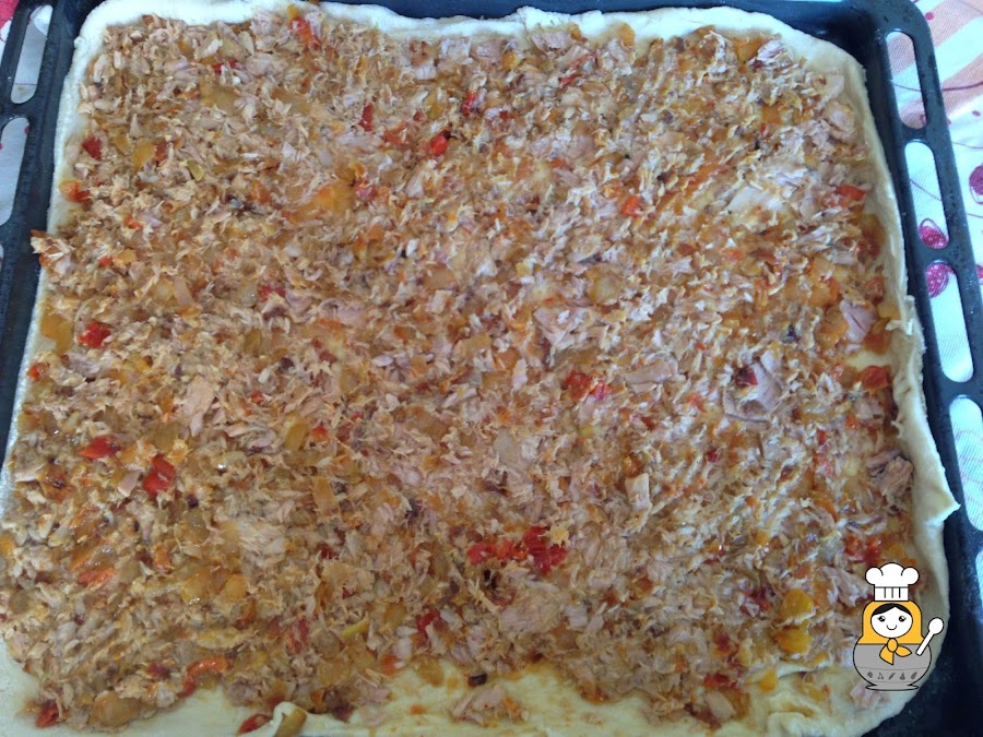 Estiramos la mitad de la masa sobre la encimera espolvoreada con harina (para que no se pegue la masa) y la colocamos sobre la bandeja del horno. Hay que estirarla bien y que sobresalga algún centímetro por el borde, para luego tener margen para cerrarla.
