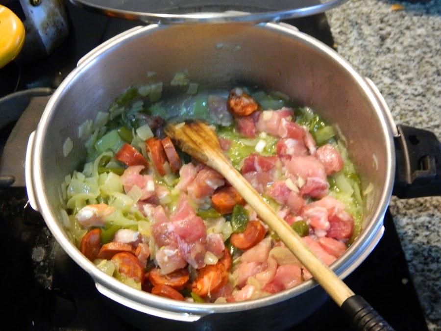 -Añadimos la panceta troceada en tiritas finas y el chorizo sin piel en rodajas o trozos regulares. Damos unas vueltas durante un par de minutos.