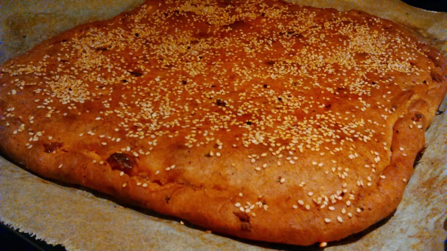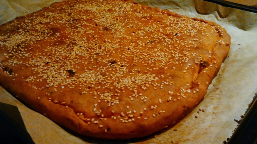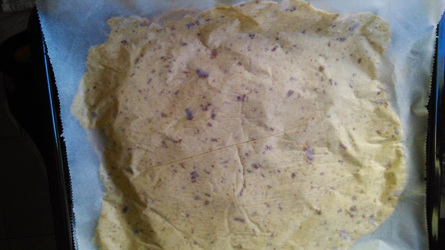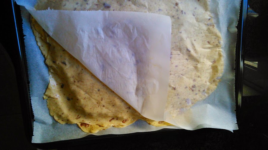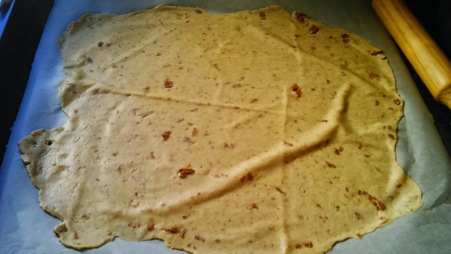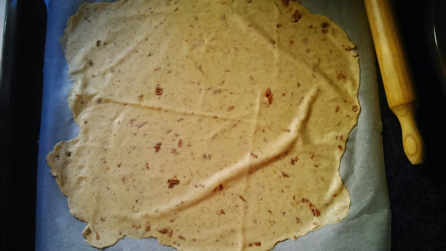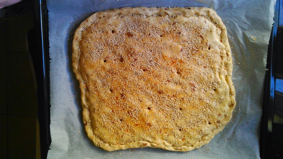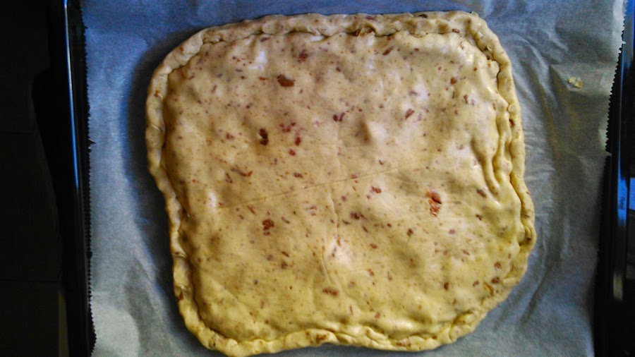 Extendemos una bola de masa, dejándola fina y que quede "más o menos" cuadrada, del tamaño de la bandeja de horno.