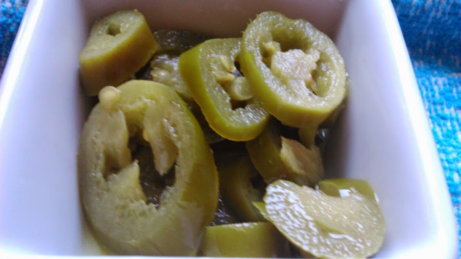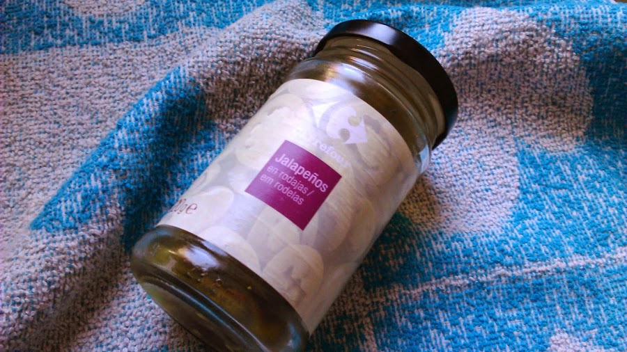Repartimos sobre este, el queso, los jalapeños y los pimientos en tiras. Espolvoreamos con el tajin (o guindillas, pimentón picante,...) a nuestro gusto, la cuestión es darle un toque picante.