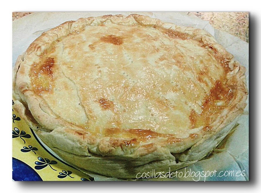 Ponemos en un molde redondo, el hojaldre forramos con el la base y las paredes .