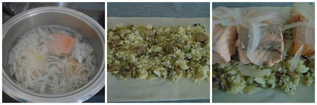 Estiramos la masa de hojaldre y la partimos por la mitad. En la bandeja del horno la forramos con papel de hornear añadimos la mitad de la masa de hojaldre y vamos montando el Kulibiak, en el centro la primera capa del relleno, la segunda capa el salmón, yo le añadí un poco de la charlota del caldo.