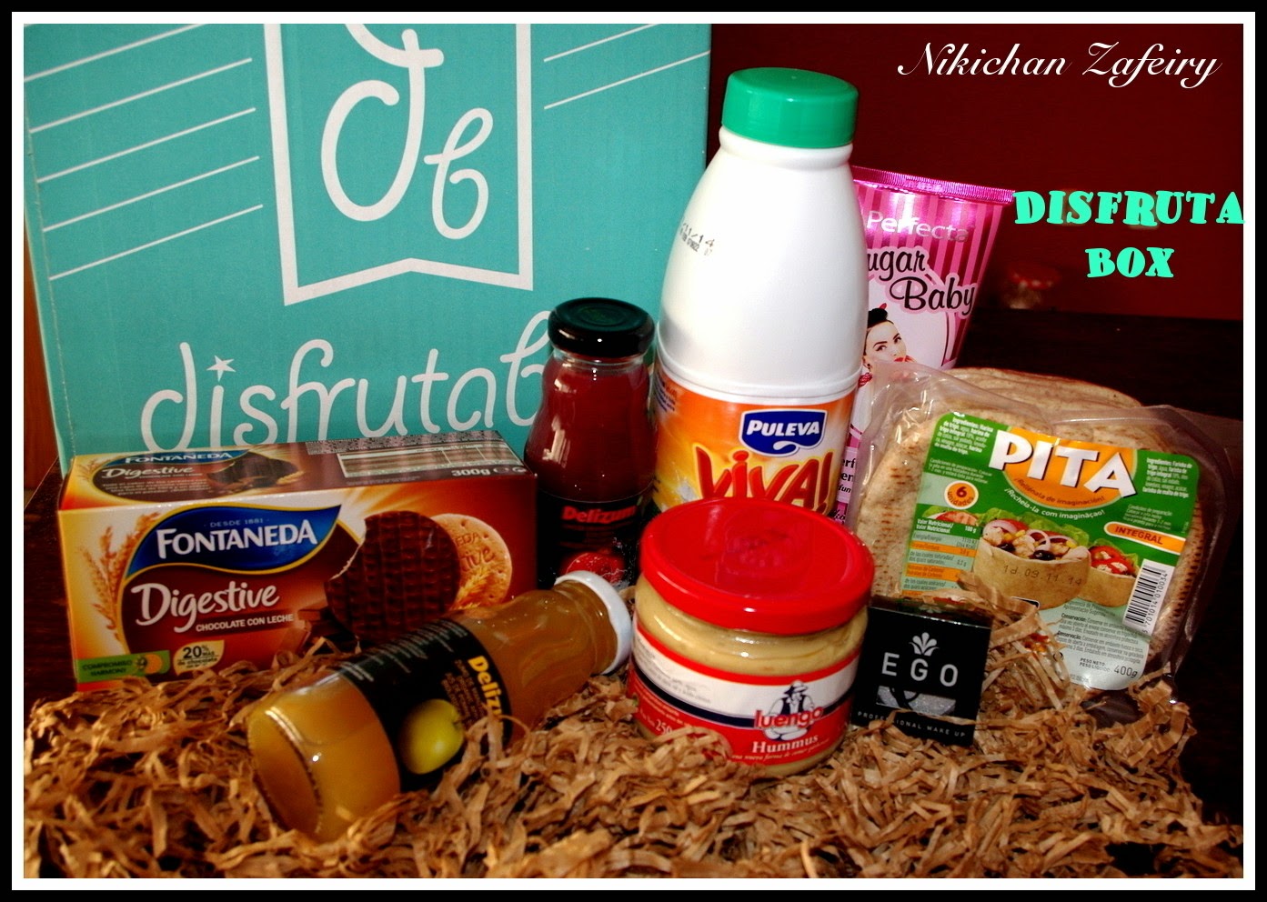 Esta es mi primera disfrutabox, este mes contenía galletas, leche, zumos, humus, crema corporal y maquillaje. Muy completa! Son como tres cajas en una: productos de belleza / cuidado personal, hogar y alimentación. En marcas con la mejor calidad.