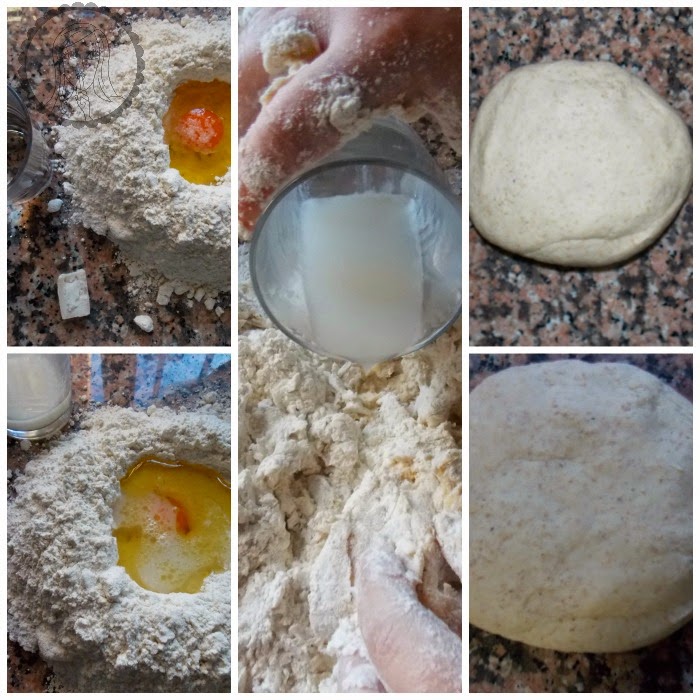 Ponemos la harina en la encimera formando un volcán, en el interior ponemos el huevo, la sal y el chorrito de aceite.