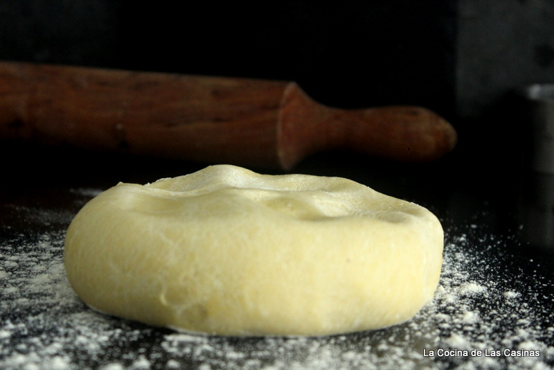Retira de la nevera y aplasta con la mano, ya ves qué bien ha quedado. Coloca en la encimera enharinada y estira con el rollo de amasar hasta que te quede una lámina de más/menos 0,5 cms. Recorta con un molde redondo de 8 cms de diámetro, aunque allí son un poco más grandes, a mí me gustan pequeñitas.