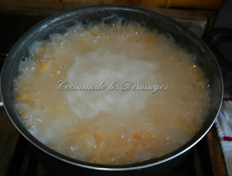 Tiramos el agua y enjuagamos el maíz, lo ponemos a hervir en una olla con suficiente agua por 2 horas aproximadamente, hasta que los granos estén blandos, si es necesario agregamos mas agua.