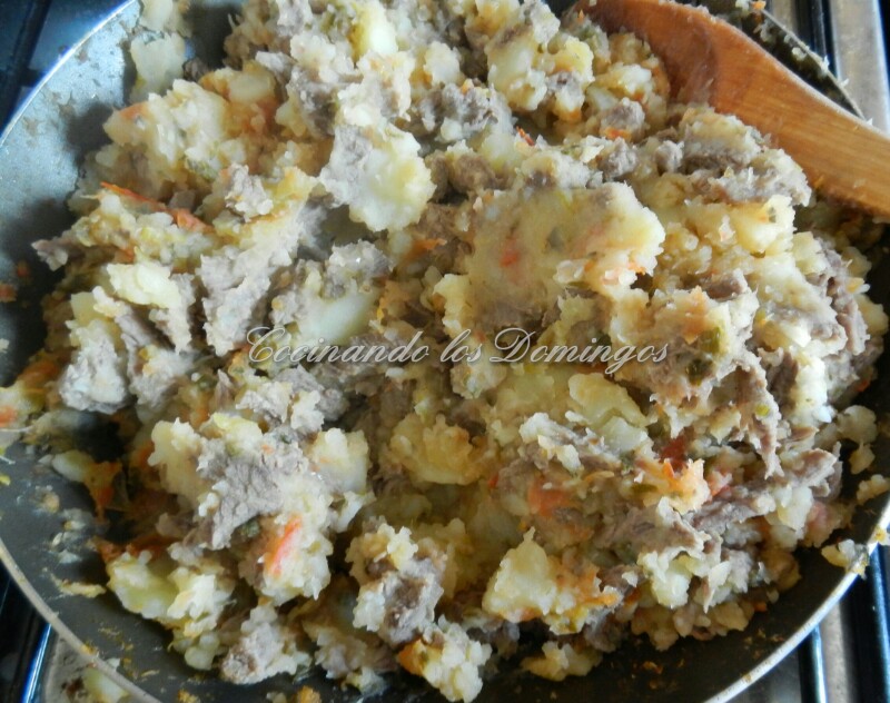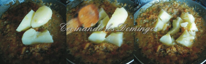 Revolver y agregar las papas. Nosotros las agregamos enteras y las deshacemos con la ayuda de una cuchara de madera a medida que las incorporamos a los demás ingredientes.