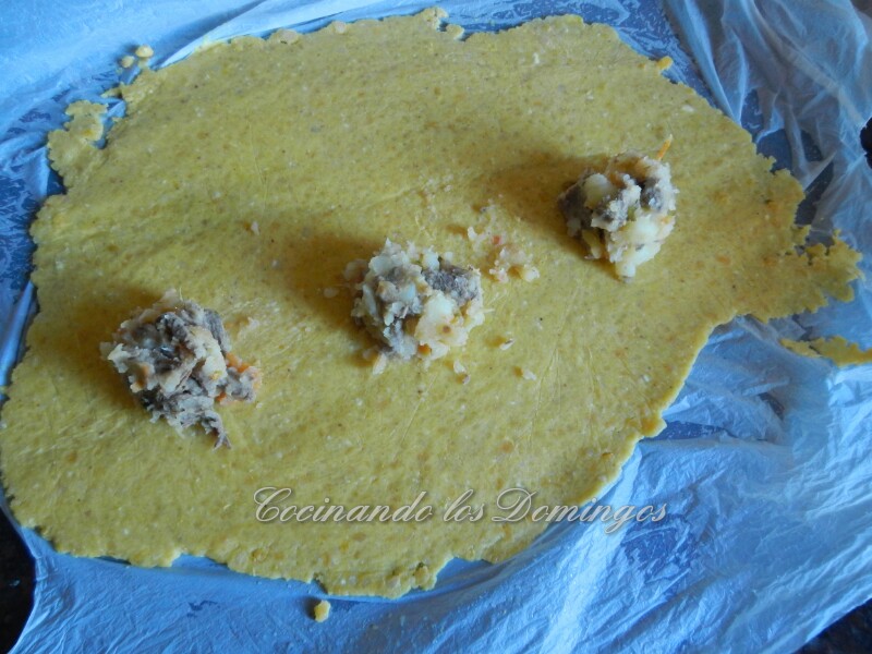 Una vez este extendida, con una cuchara vamos poniendo el relleno en el centro de la masa, separado uno de otro para que se pueda dar forma a las empanadas (como se puede ver en la foto)