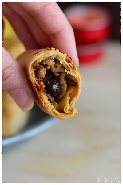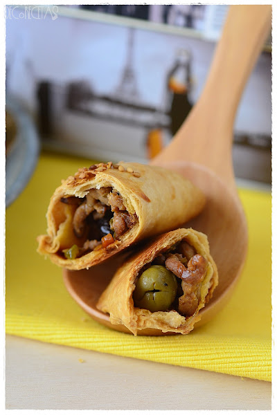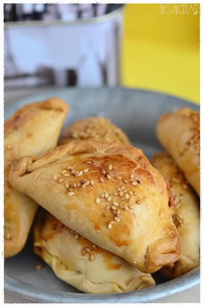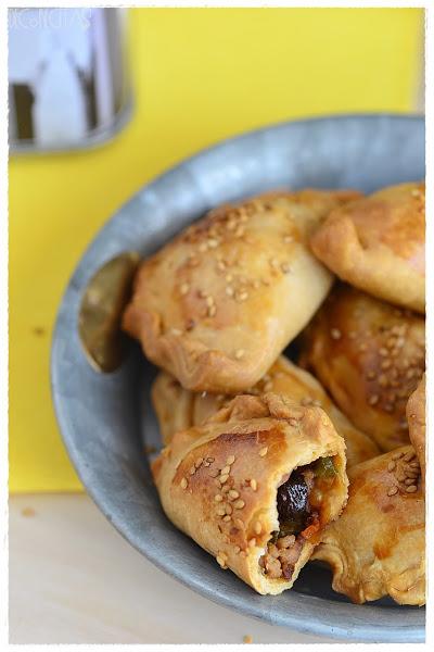 Para realizarlas, hice la masa de la mima manera que aquí, ya que me gustó muchísimo como me había quedado la vez anterior. Cambiamos el relleno, pochando cebolla, añadiendo pimiento verde y zanahoria, y por último, la carne picada salpimentada. Una vez cocinada, añadimos unas uvas pasas y las aceitunas. Realizamos círculos con la masa, rellenamos, cerramos, y al horno, añadiendo un poco de sésamo por encima.