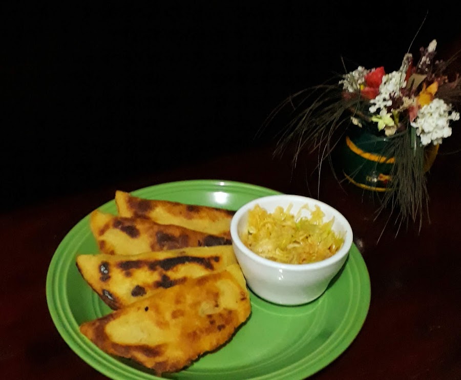 Para preparar la carne en una olla de presión caliente colocar el aceite y achiote luego la carne dejar dorar por ambos lados,ya lista coloque la salsa inglesa,mostaza,orégano,sal,pimienta,tomate,cebolla mezcle cocina 5min,luego agregar el agua hasta cubrir tapar la olla y dejar cocinar hasta suavizar la carne,una vez lista sacar picar y desmechar,reserve media taza del caldo de la cocción de la carne,para preparar la masa de las empanadas en un tazón mezcle la harina de maíz,agua y sal amase y dividir en bolitas,cada bolita presionar a formar una tortilla,coloque 1cda de carne desmechada cerrar a formar una empanada,así hacemos el resto,con las empanadas listas freír en el aceite caliente dejar hasta dorar,ya lista coloque en papel toalla para eliminar exceso de grasa,servir calientes junto con el repollo picado al que le agregamos la media taza del caldo de cocción de la carne tibio que reservamos,probar sal,pimienta y tabasco o otro picante antes de servir.