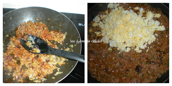 Dorar la cebolla con el ajo, añadir la carne y cocinar, agregar las pasas, las aceitunas y el tomate. Al final el huevo duro y el perejil.