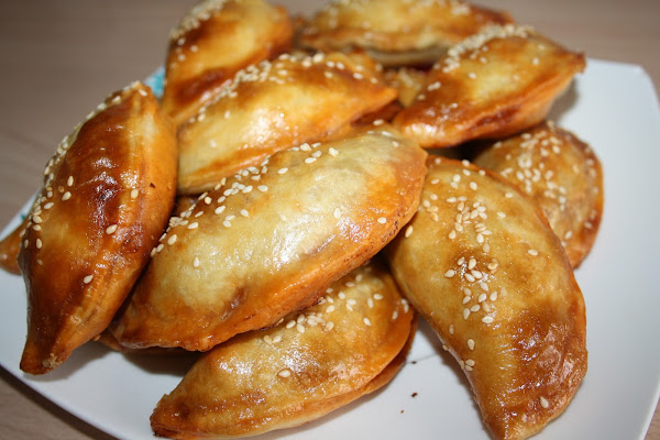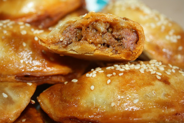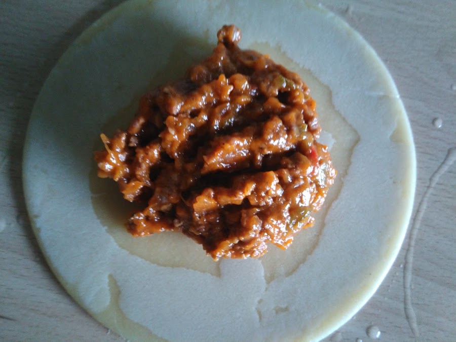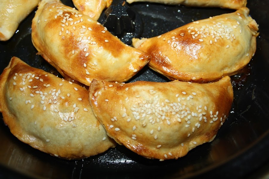 Para el formado de las empanadas: Pincelamos los bordes del disco con agua, lo cogemos con la mano, rellenamos el centro con la carne, formamos una media luna y vamos cerrándola presionando ambos extremos con las yemas de los dedos. Reservamos.
