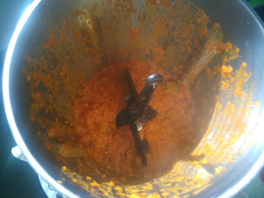 Incorporamos el pimiento verde y rojo a trozos, trituramos 4 seg a vel 5. Incorporamos el tomate concentrado. Colocamos el protector de cuchillas y programamos 5 min, vel 1, temp 120.