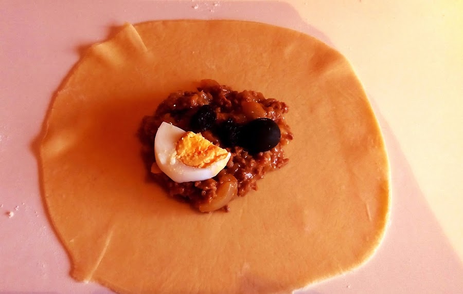 En cada círculo pon relleno de la carne, un trocito de huevo duro, una aceituna negra y una o dos pasas.