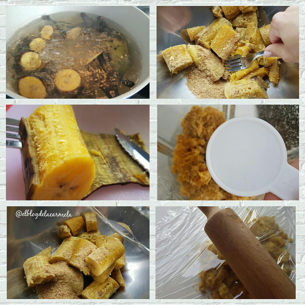machacar los plátanos en un bol al que agregamos 2 cucharadas de semillas de lino – ojo! Si en este punto observamos que el plátano queda en grumos porque no este suficientemente cocido podemos ayudarnos de una batidora para terminar de procesarlo junto a un par de cucharadas de agua. Lo importante es que quede una masa suave y manejable y dependerá mucho el tiempo de cocción de el grado de maduración de los plátanos