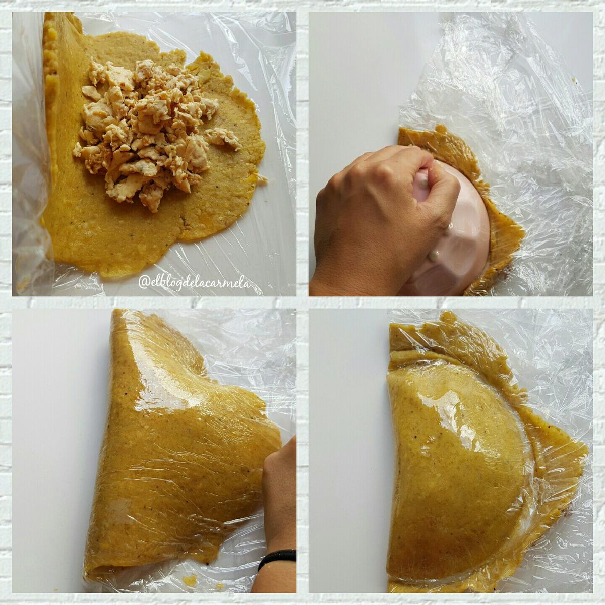 amasar sobre papel film transparente para dar forma a las empanadas y rellenar de la picada de pollo o de cualquier otra proteína que os apetezca (como atún, sobras de caldo de pollo, etc…)