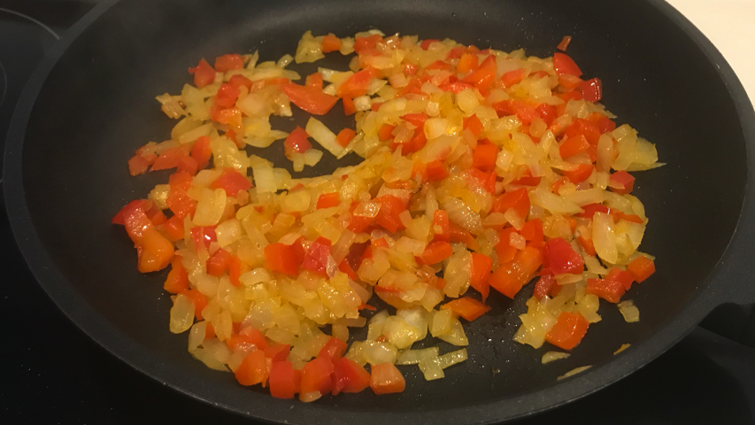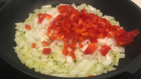 Pocha cebolla y pimiento con un poco de sal.