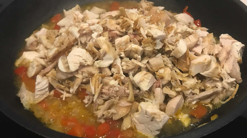Cuando esté pochado incorpora el pollo.