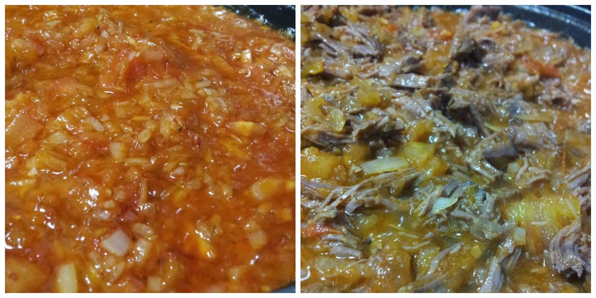Se pone a cocinar la carne con ajo y algo de sal por aproximadamente 45 minutos, cuando este blanda se saca y se pica finamente.