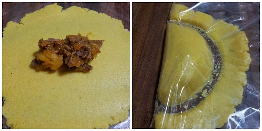 Al centro de la masa ponemos una ración de relleno y siempre con la ayuda del plástico doblamos a mitad. Con un vaso u otra forma circular comprimir bien hasta formar una media luna, ( atención a que no salga el relleno)