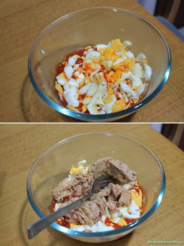 First we boil eggs, peel once they are ready and booked. In a bowl cast tomato sauce, chopped eggs and cans of tuna.