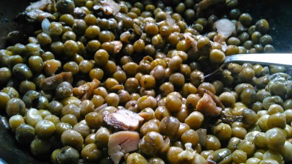 Como mis guisantes estaban cocinados con pollo, opté esta vez por seguir los pasos de las árabes, agregando el resto de ingredientes (aunque no llevan pollo), la receta original podéis verla aquí, eso sí, a mi rollo.