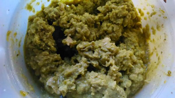 Apartamos unas tres cucharadas de guisantes y el resto lo trituramos un poco, para darle una textura más blandita. Mezclamos con los enteros.