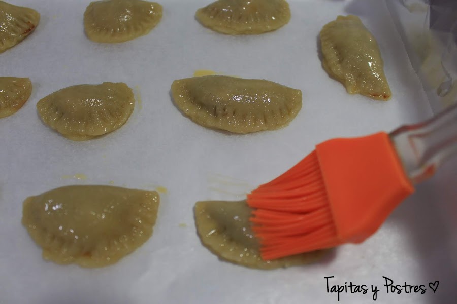 Cerramos las empanadillas, sellamos los bordes con un tenedor y pintamos con huevo batido.