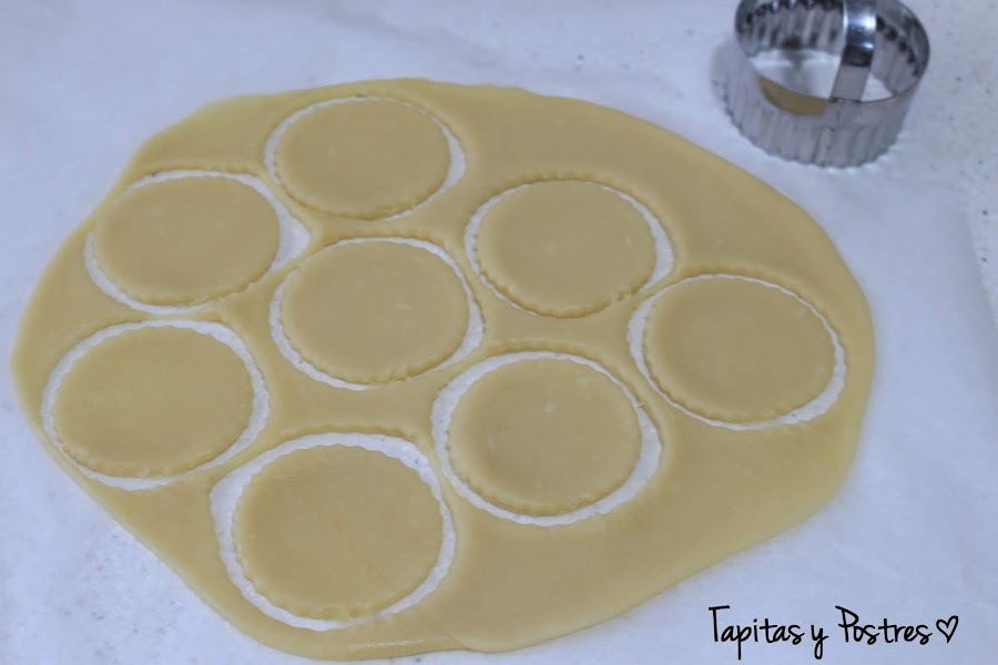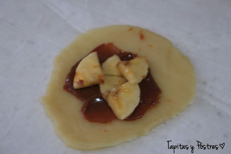 Cortamos círculos con un cortapasta o un vaso. Ponemos una cucharadita de dulce de leche en el centro y una rodaja o dos de plátano troceada. Cerramos la empanadilla y la sellamos con un tenedor haciendo muescas en los bordes.
