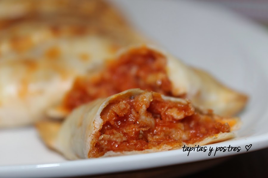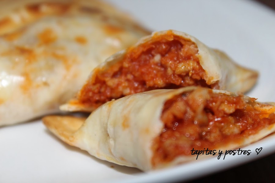 El domingo hice lasaña y con un resto de la salsa boloñesa que sobró, rellené unas obleas de empanadillas, pero en lugar de freírlas las hice al horno.