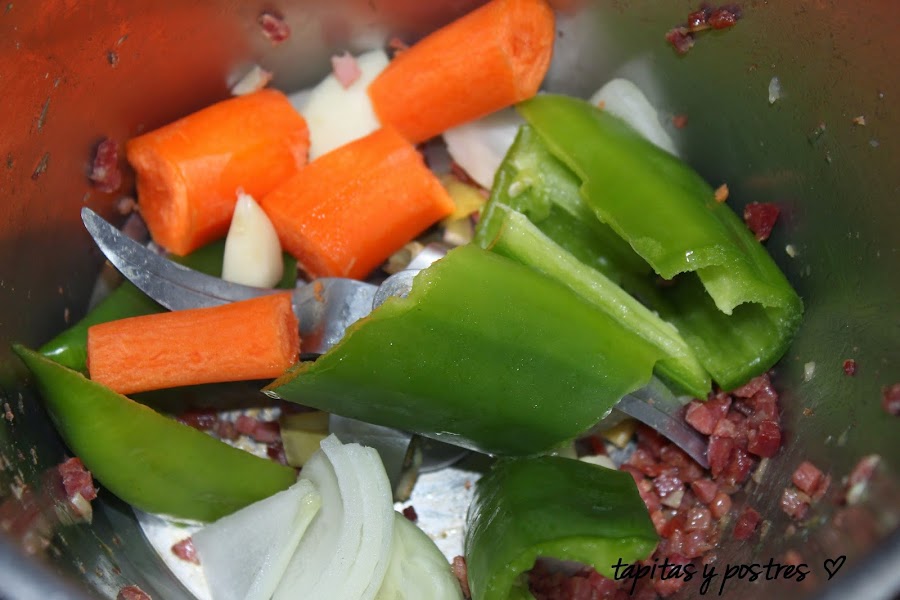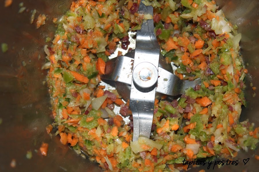 Echamos en el vaso todos las verduras del sofrito y el jamón y trituramos 15 segundos, velocidad 5.